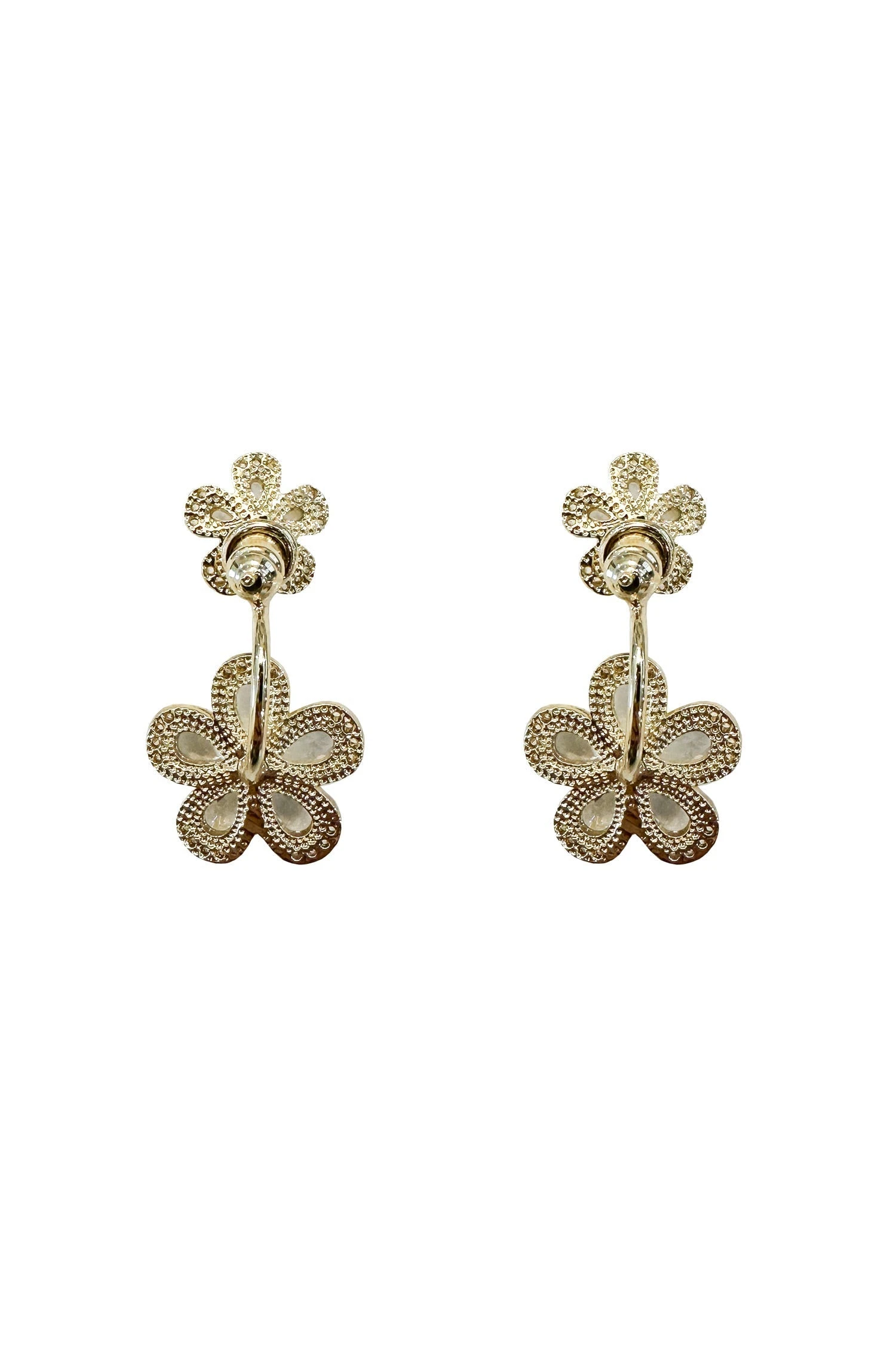 The Blina Gold Flower Earrings are bound to draw attention with any look. Rendered from gold hardware and encrusted with a diamante trim. This design features a double delicate flower design for a feminine aesthetic.