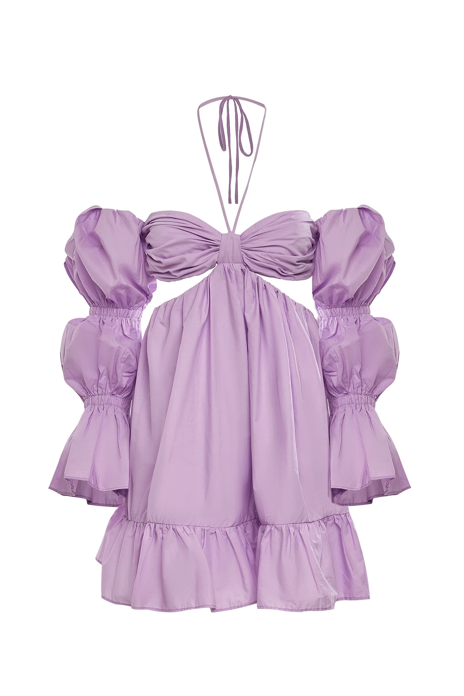 Flirty and feminine, the Dalida Dress will be the fixture of your spring wardrobe. Designed with a halter neckline, off-shoulder puff sleeves, and waist cut-outs. This mini dress is fitted with a flattering a-line silhouette and ruched bodice.