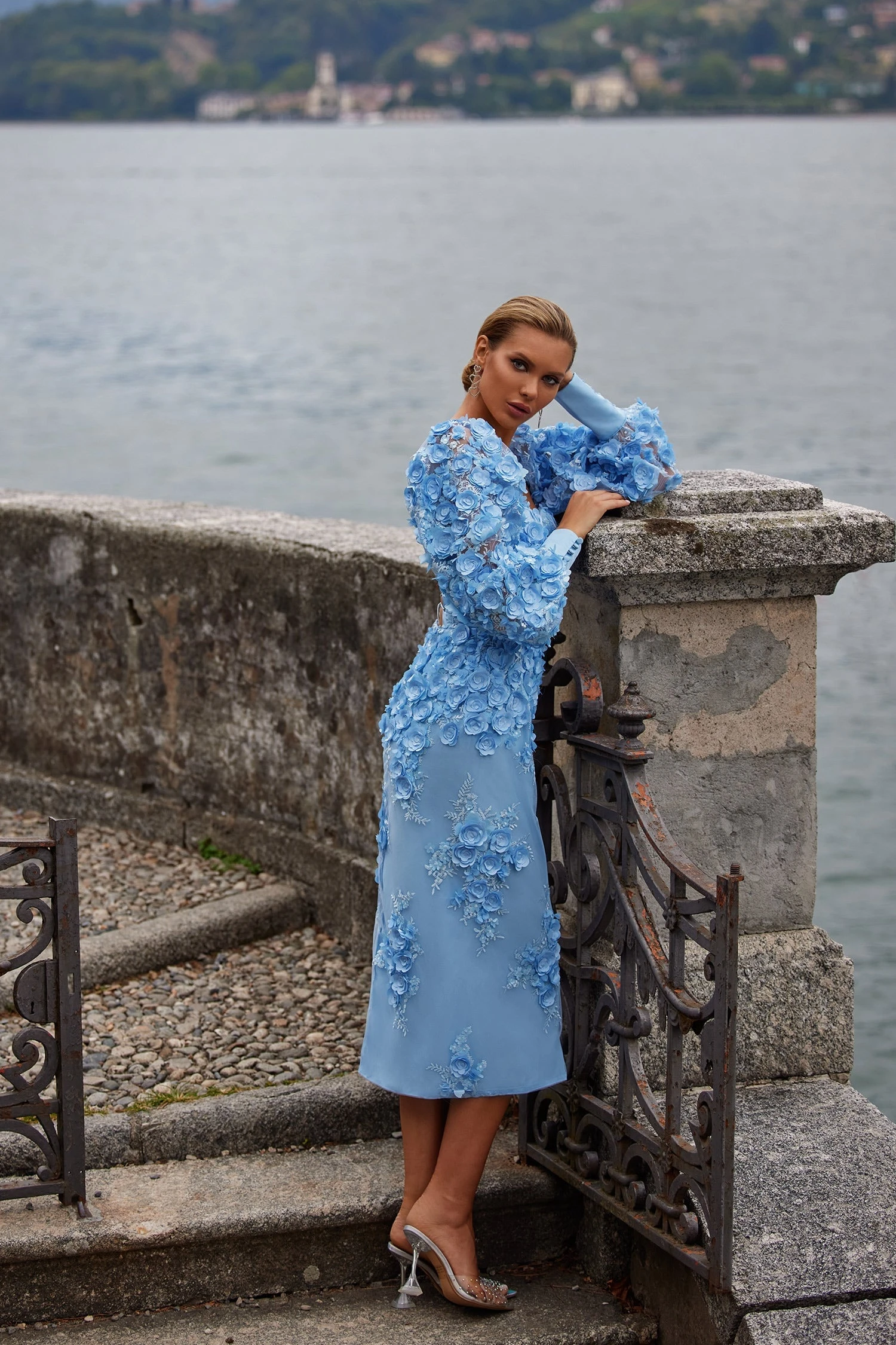 Feminity takes control in the Ginvra Dress. Created in a blue tone and elevated with a lace-up back, bishop style sleeves, and a straight-fit silhouette. This luxurious midi dress is rendered from our favourite 3D floral fabric to allow all the attention to fall on you.Â