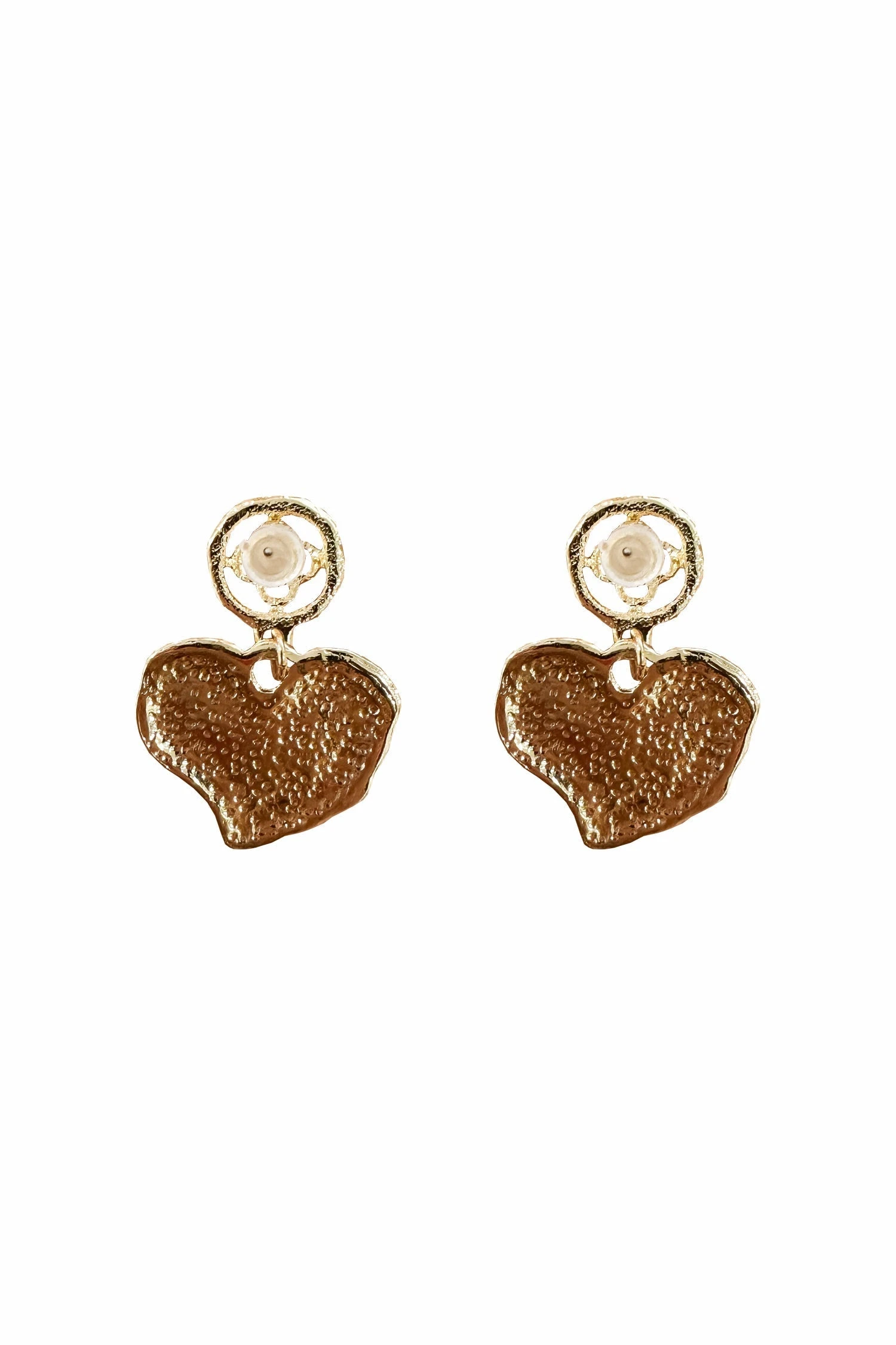 The Ramiza White Drop Heart Earrings feature a textured gold hardware stud with a dropped polished pearl heart accent. Pair these perfectly with any of your Alamour looks.