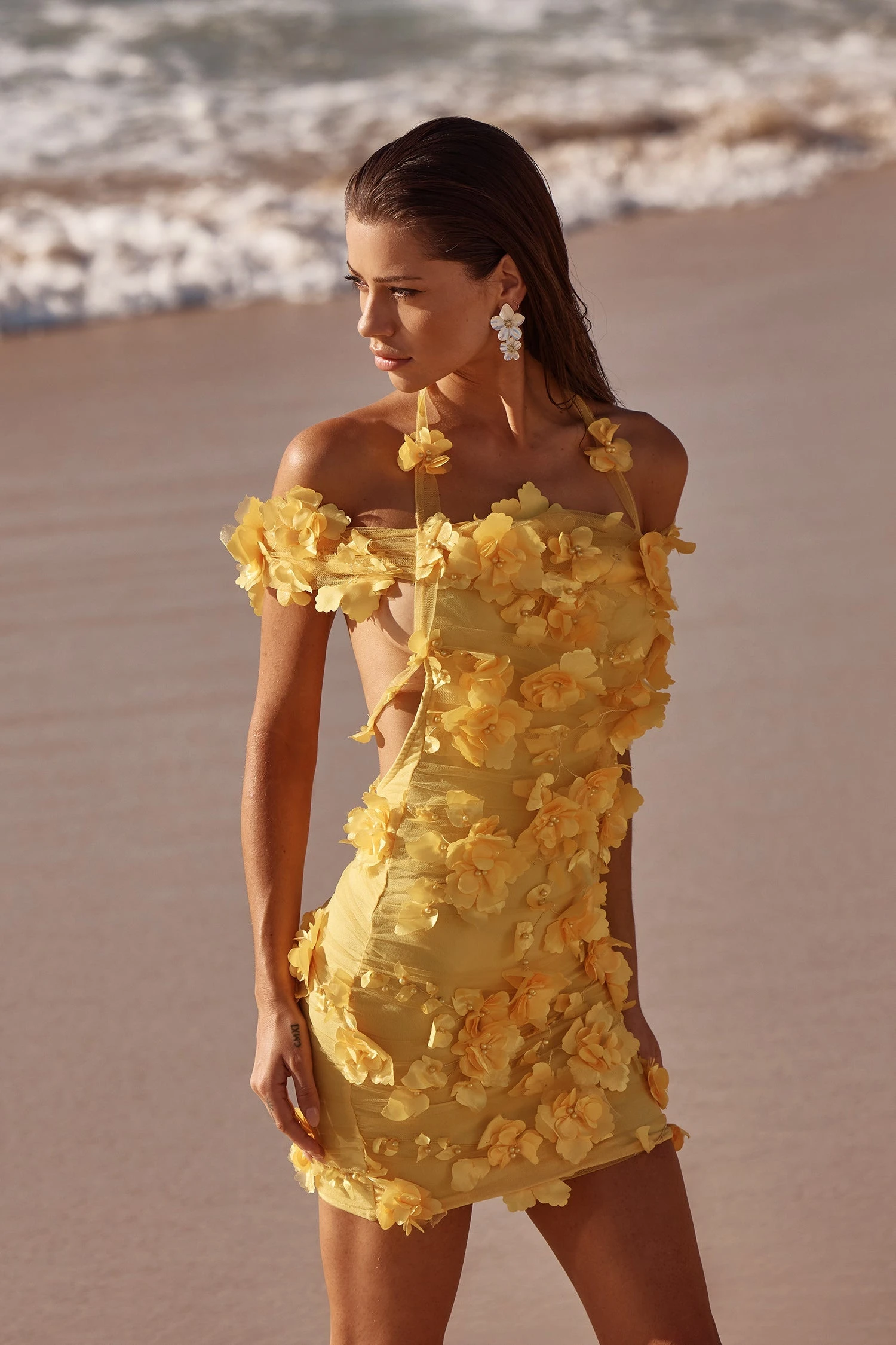 Meet the Ruby Dress – summer’s newest must have! This mini dress is guaranteed to make a statement. With its vibrant yellow colour made from our signature floral 3D fabric, this ensemble is perfect to dazzle the crowds in. Featuring a halter neckline, non stretch fabric and side bodice exposure, accentuating your curves. This beautiful set is perfect for birthday parties, hens night, night out with the girls, beach clubs, rooftop bars.Â