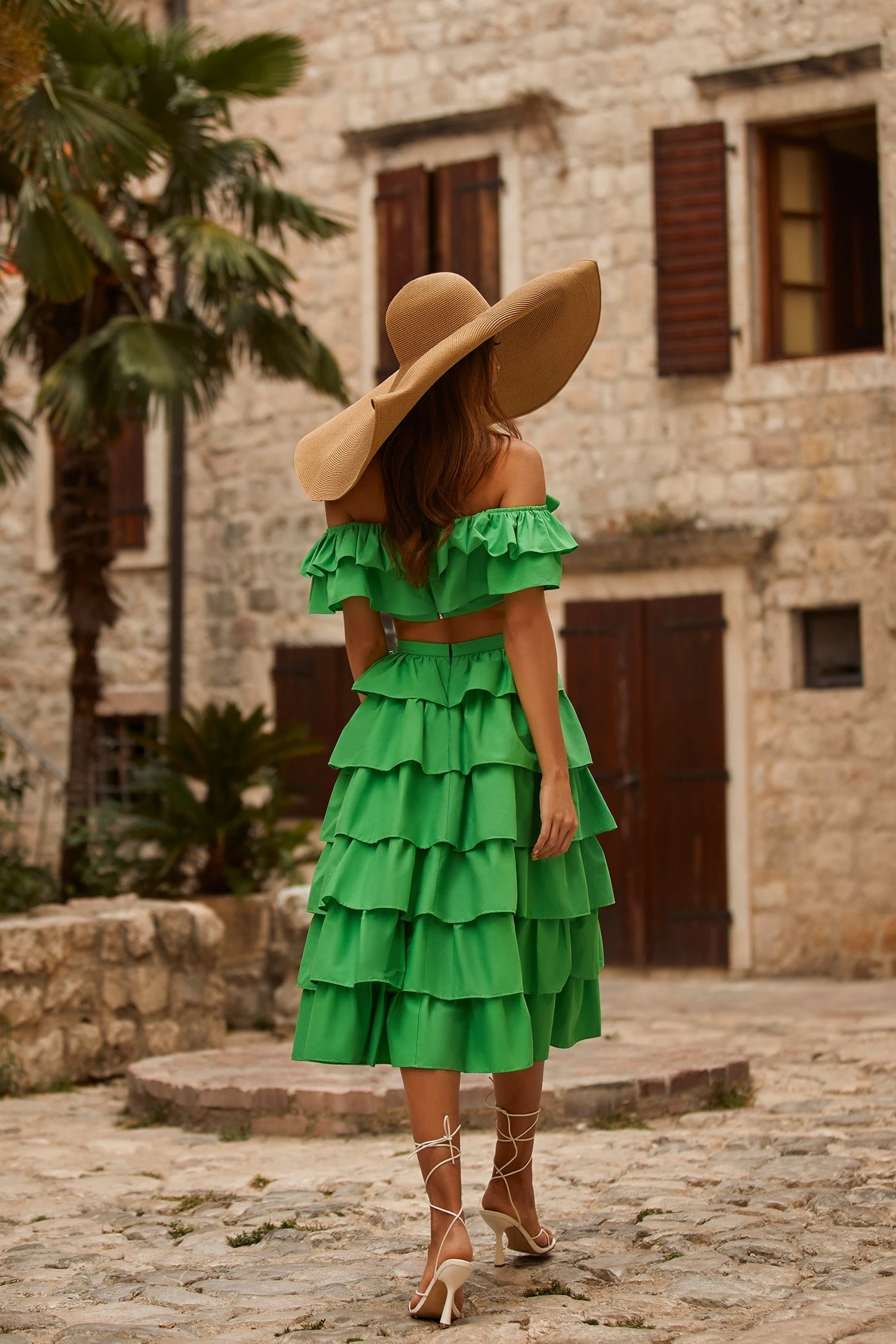 Indulge in maximalism courtesy of the Tia Set. In a bright emerald hue, with voluminous tiered ruffles, this two-piece set favours modernity. Designed with off-shoulder sleeves and an a-line skirt. Â